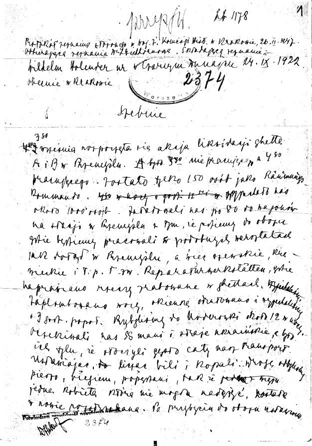His story is described in a separate entry, and the new document concerns his account of the camp in Szebnie. The document shows that in 1943 Wilhelm was in the working ghetto (known as ghetto A) in Przemyśl. It is not known how he ended up there, probably after escaping to the east after the outbreak of the war he reached the area around Przemyśl. In September 1943 the Germans ordered the liquidation of the ghetto, some prisoners were sent to the camp in Auschwitz, some were shot on the spot and some were sent to labor camps. Wilhelm, with a transport of other prisoners, ended up in the forced-labor camp Szebnie (about 100 km west of Przemyśl, near Jasło). According to his account, everyone worked there in their profession, but it is not known what position Wilhelm himself held. The account ends after describing the mass searches that took place about a week and a half after arriving at the camp. The document ends with the sentence “Unfinished testimony, the person testifying left.”
