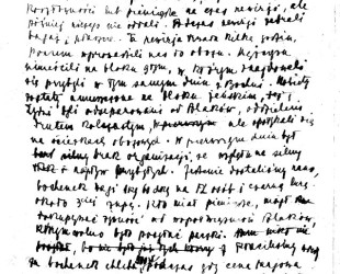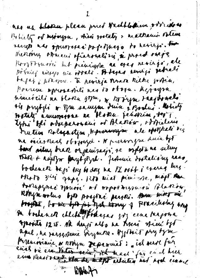 After arriving at the camp, we were lined up in the square in front of the Wachblok, women were separated from men, children were left with their mothers. Then they began to let us out one by one for a search. Some of the OD men offered to keep valuables or money for the time of the search, but later they did not give us anything. During the search, they took our luggage and coats. This search lasted several hours, then they led us into the camp. The men were placed in block 9, where there were those who had arrived from Bochnia on the same day. The women were placed in the women's block. Jews were separated from Poles, separated by barbed wire, but they met on the camp paths. On the first day there was a lack of organization due to the strong influx of new arrivals. We got food in the morning, a loaf weighing 1 kg 60 dkg for 12 people and black soup, about 3 soup. Those who had money could buy food from fellow Polish prisoners, who were allowed to send packages. We paid 500 zlotys for a loaf of bread at that time, while the market price was 12 zlotys.