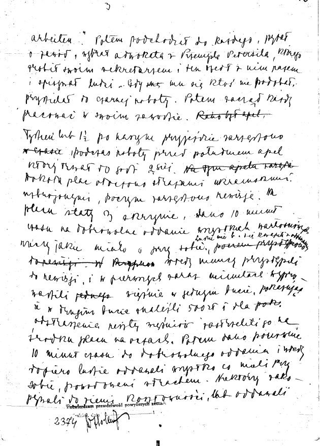 A week or a week and a half after our arrival, a roll call was called during work before noon, which lasted until 2 a.m. The square was surrounded by armed Ukrainian guards, after which searches were ordered. There were 3 boxes in the square, and people were given 10 minutes to voluntarily surrender all the valuables they had with them. People were not very eager to give it back. Then the Germans started searching and in the first few minutes they took out a prisoner in one shoe, showing that they had found 500 złoty in the other shoe and to scare the rest of the prisoners they shot him in the middle of the square in front of everyone. Then they were given another 10 minutes time to voluntarily surrender and only then did people surrender everything they had on them, driven by fear. Some buried valuables in the ground or gave them to Ukrainian guards, which were later searched by the Germans and some of these things were taken from them.
